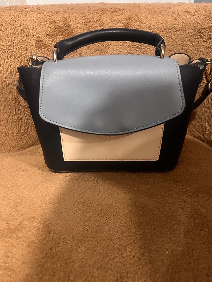 Gri deri kadın el çantası, tokalı kapak ve önünde küçük bej cep ile tasarlanmıştır. Üst saplı, günlük kullanıma uygun modern tarzdadır. Mango markadır ufak aşınmaları vardır.