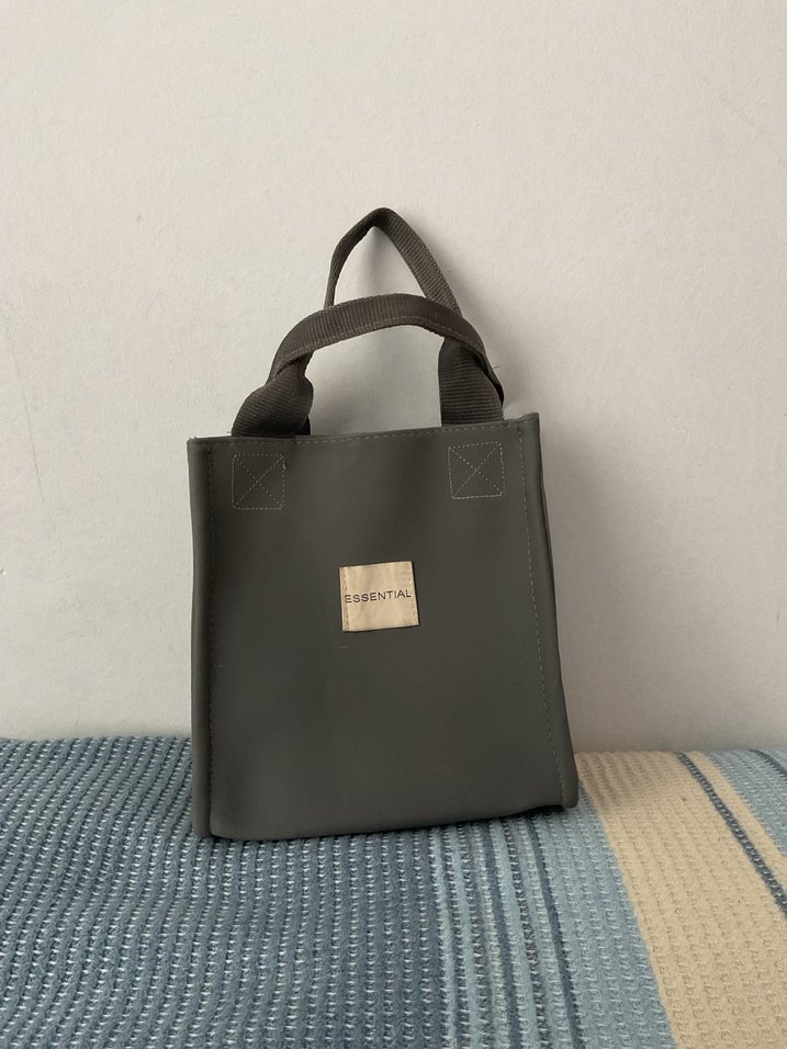 Bu gri deri kadın el çantası, minimal ve desensiz tasarıma sahiptir. İki saplı ve önünde küçük 'ESSENTIAL' etiketi bulunur, günlük kullanım için zahmetsiz şıklık sunar.