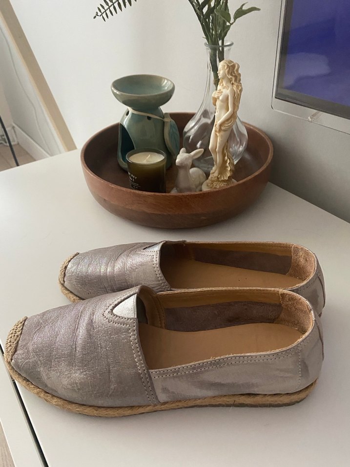 Gri deri kadın espadril, dolgu topuklu ve minimalist tasarıma sahip. Günlük kullanım için rahat ve şık, desen içermeyen çağdaş bir stil sunar.