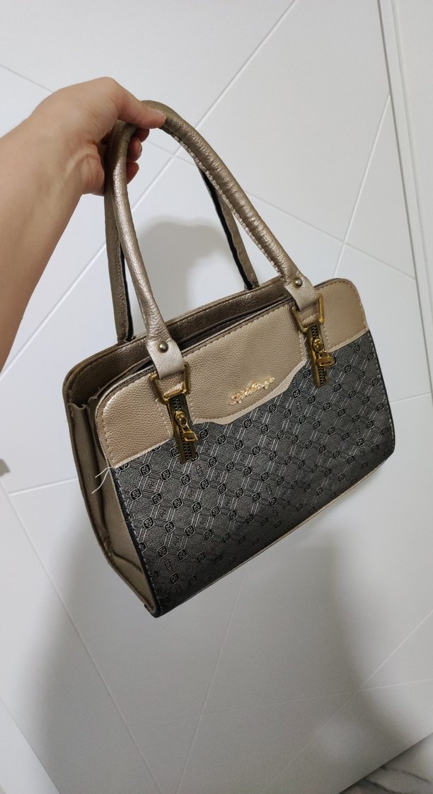 Bu kadın çantası, gri deri ve yılan derisi desenine sahip, tokalı saplarıyla modern klasik ve iş şıklığını bir araya getiriyor.