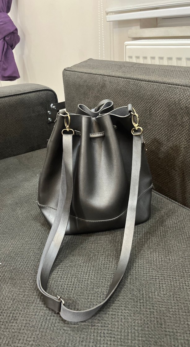 Gri deri, tokalı kadın omuz çantası. Minimalist tarzda, desen içermeyen ve ayarlanabilir askılı, günlük ve sokak modasına uygun.