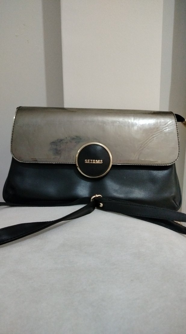Gri deri omuz çantası, tokalı kapak ve baskılı detaylara sahip. Modern klasik ve Paris tarzını yansıtır. 'SETRMS' yazılıdır.