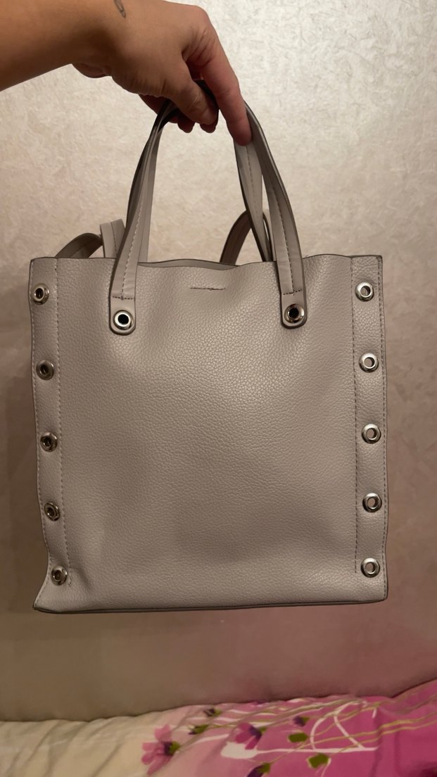 Bej deri kadın çantası, yanlarında tokalı detaylar ve desen içermeyen minimalist tasarıma sahip, günlük kullanım için uygundur. İki omuz iki el askısı var. İçi fermuarlı. Pudra rengi de mevcut orjinal zara