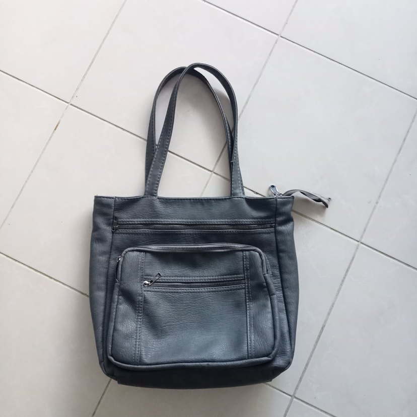Gri deri kadın çantası, minimal tasarımlı ve çoklu fermuarlı ceplerle günlük kullanıma uygun, sade ve sokak tarzı görünümlü geniş iç hacimli.