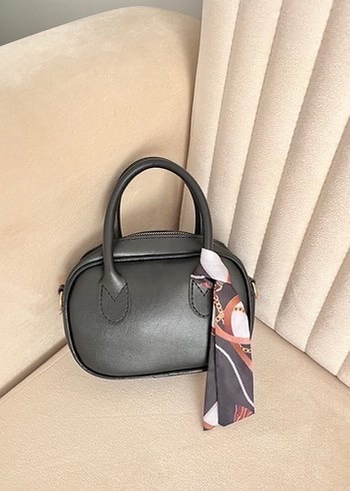 Gri deri kadın çantası, tokalı detay ve süs fularıyla şık bir tasarıma sahiptir. Kompakt boyutuyla günlük sokak stiline uygundur.