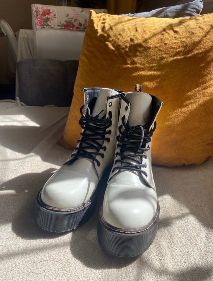 Gri deri kadın platform botları, tokalı detaylarıyla grunge punk tarzını günlük şıklıkla birleştirir.