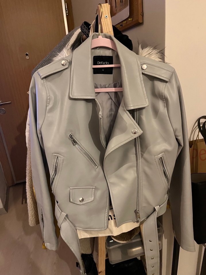 Gri deri kemerli kadın ceket, oturmalı kesim ve kesimli yaka detayına sahiptir. Günlük kullanıma uygun, normal boyda ve askılı kolludur.