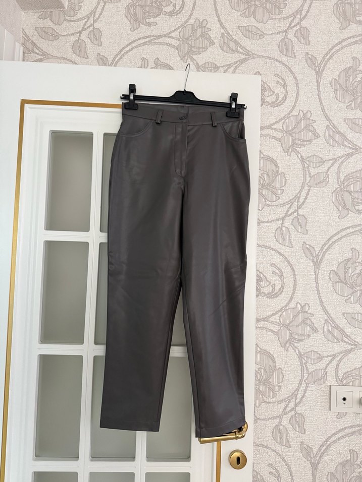 Gri deri kumaştan yapılmış, kemerli ve normal boyda, regular fit kadın pantolon. Ofis için uygun, trend bir görünüm sağlar.