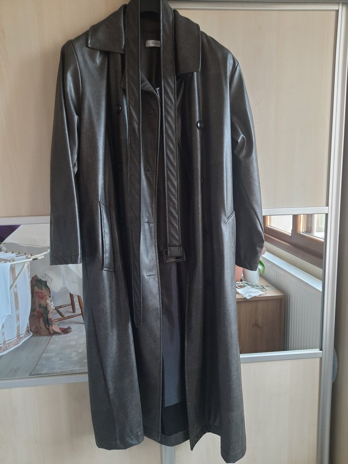 Gri deri uzun manto, kemerli bel ve kesik yaka ile regular kesime sahiptir. Düz desensiz, ofis ve gotik tarzlar için uygundur. renk koyu füme gibi 42 beden ama salaş kesim ben 46 48 giyiyorum oluyor bir defa giydim