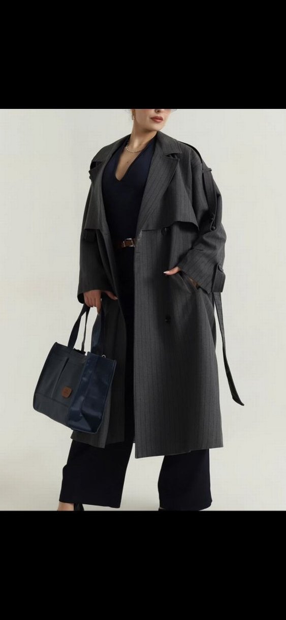 Gri deri, kemerli, uzun trençkot. Notch yaka ve kayışlı kollara sahip, günlük kullanıma uygun rahat kesim.