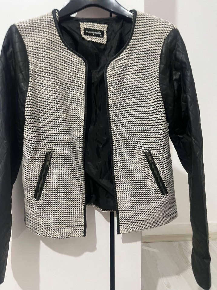 Gri sentetik kumaş gövde ve siyah deri görünümlü uzun kollara sahip, fermuarlı cepli, notched lapel yaka kadın ceket. Günlük sokak stiline uygun.
