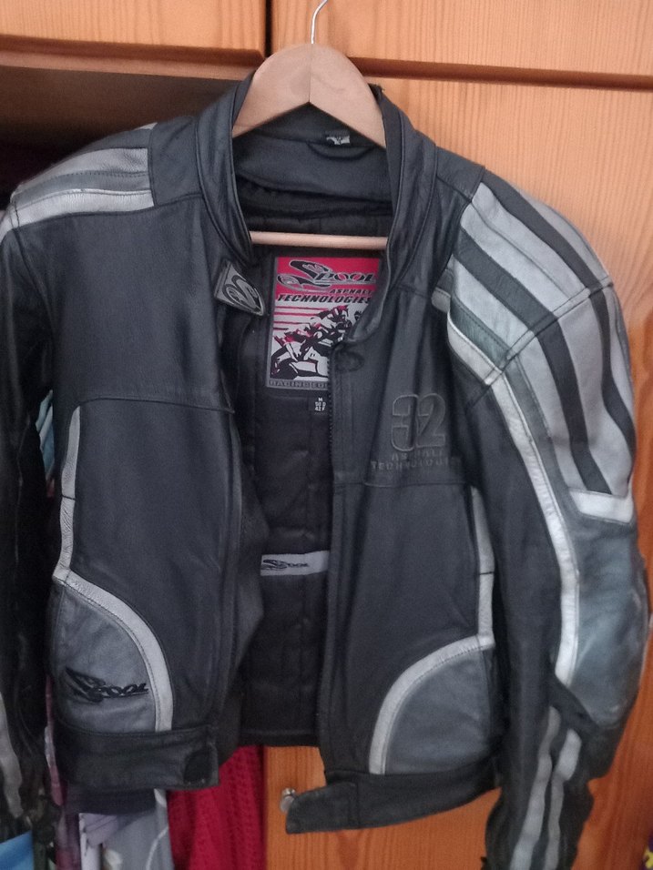 Gri deri biker ceket, fitted kesim, bisiklet yaka ve fermuarlı ön yapıya sahiptir. Uzun kollu, normal midi boyda, günlük sokak stiline uygundur. Orijinal Spool marka, omuz ve dirsek korumaları mevcuttur.