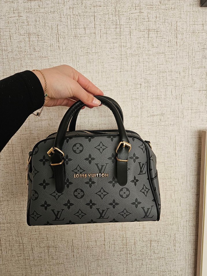Gri deri, baskılı desenli Louis Vuitton kadın çantası, fermuarlı ve modern klasik tarzda, trend günlük kullanıma uygun.