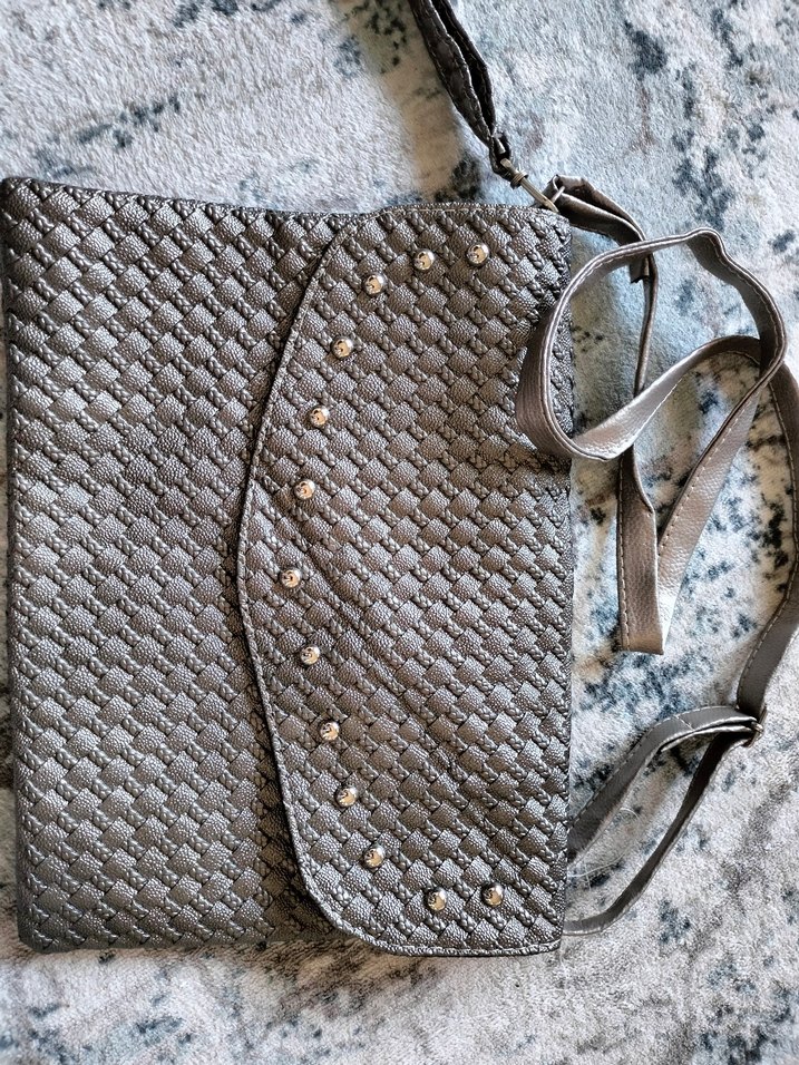 Nakışlı desenli ve tokalı kapaklı gri deri kadın çantası, rahat bohem tarzıyla günlük kullanım için uygundur.