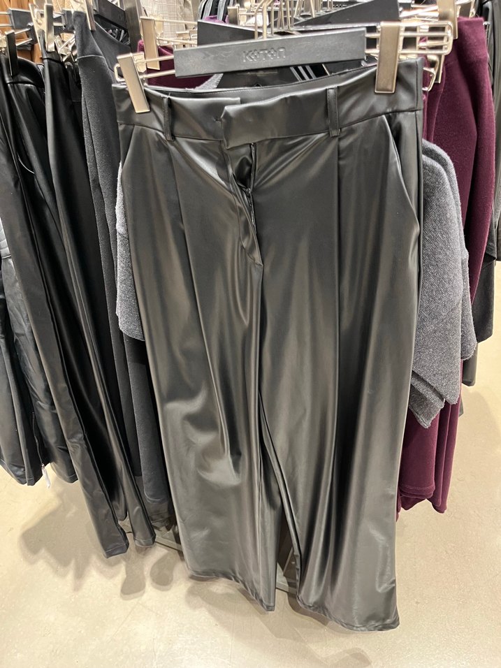 Gri deri, pilili midi boy, bol kesim kadın pantolon. Desensiz ve ofis kullanımı için uygun, sokak stili ve athleisure tarzını yansıtır.