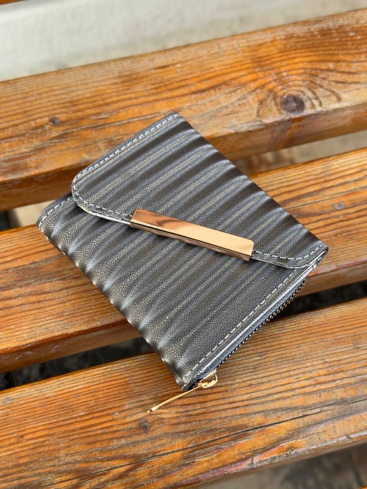 Gri deri, pliseli dokusu ve çizgili deseni ile günlük kullanıma uygun, çağdaş Paris tarzında kadın portföy cüzdanı. ✨