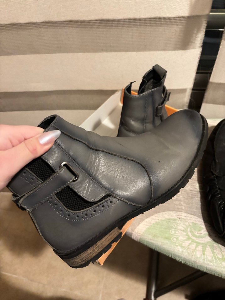 Gri deri biker botlar, tokalı ve blok topuklu, sokak stiline uygun günlük kullanım için idealdir.