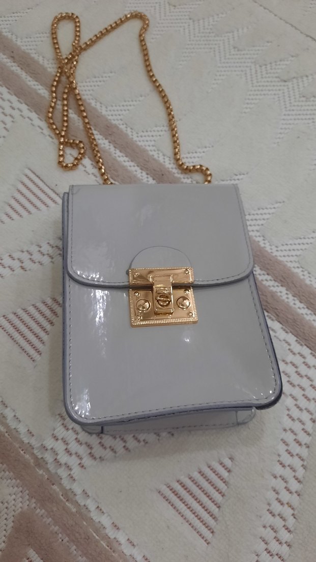 Altın tokalı ve zincir askılı küçük gri deri çanta, parlak yüzeye ve hafif yılan desenine sahiptir. Günlük sokak stili için uygundur.