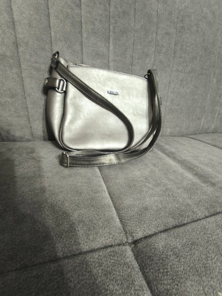 Gri deri tokalı kadın çanta, desensiz minimalist tarzda, trend sokak stili için uygun.