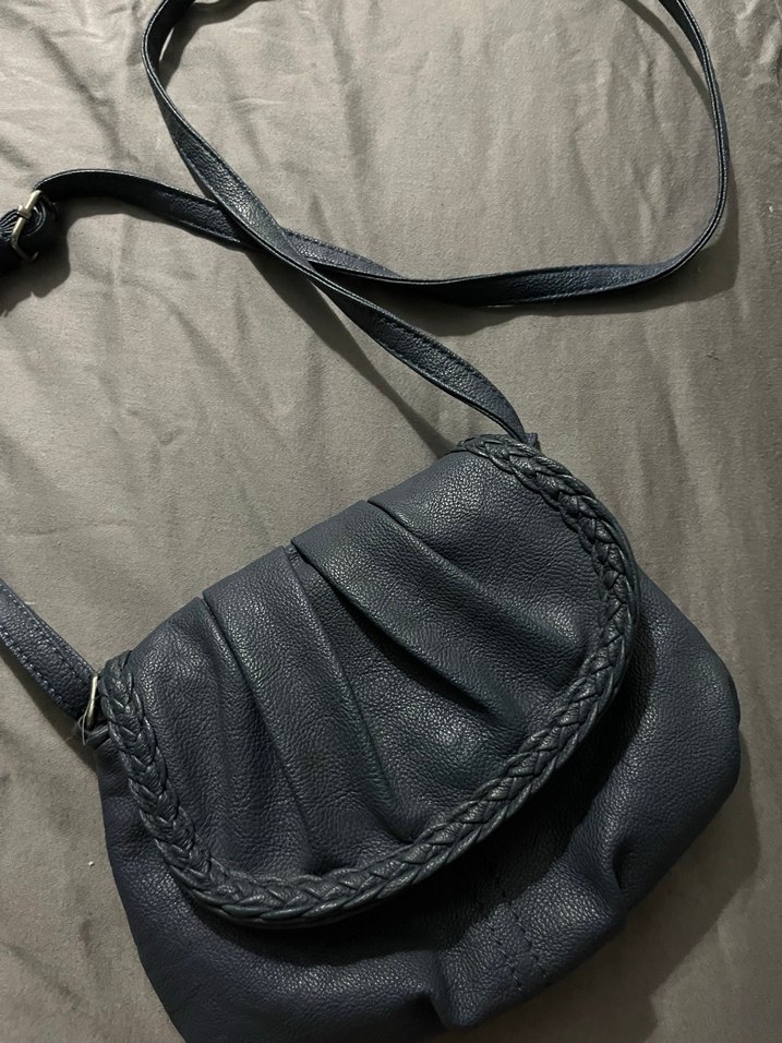 Tokalı kapak ve örgü detaylı, gri deri kadın çantası. Minimalist, desensiz ve rahat sokak stiline uygun.