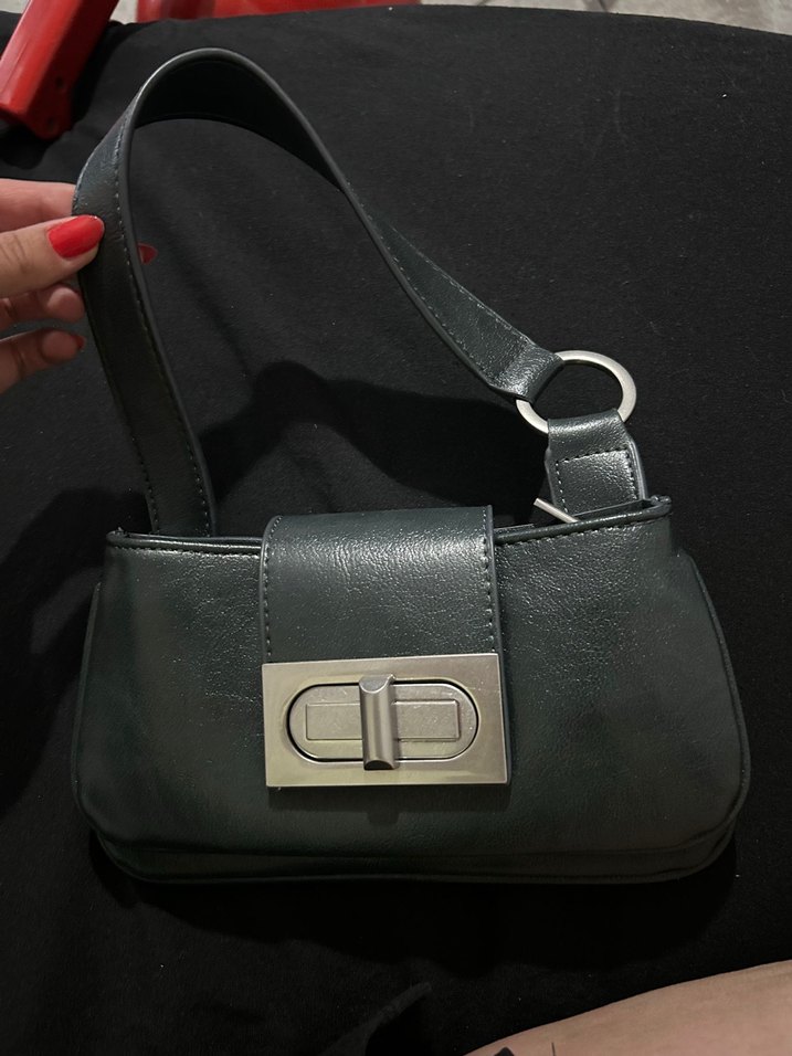 Gri deri, tokalı kapaklı, minimal ve goth tarzda kadın çantası, cesur günlük kullanım için uygun. yeni