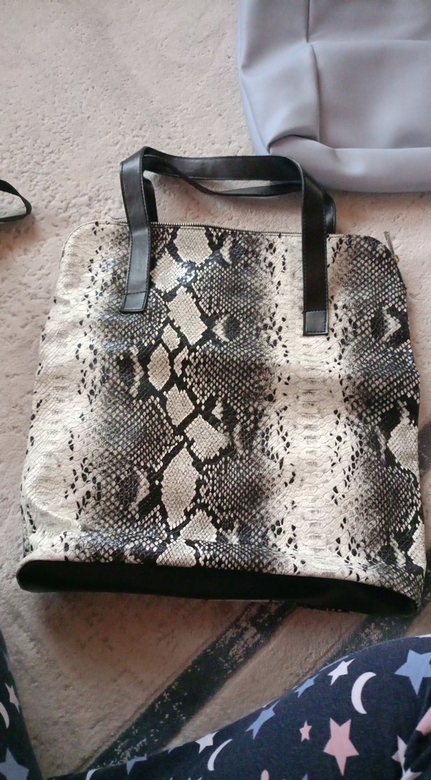 Gri deri yılan desenli kadın çanta, fermuarlı ve siyah saplı. Sokak stili ve günlük kullanım için uygundur.