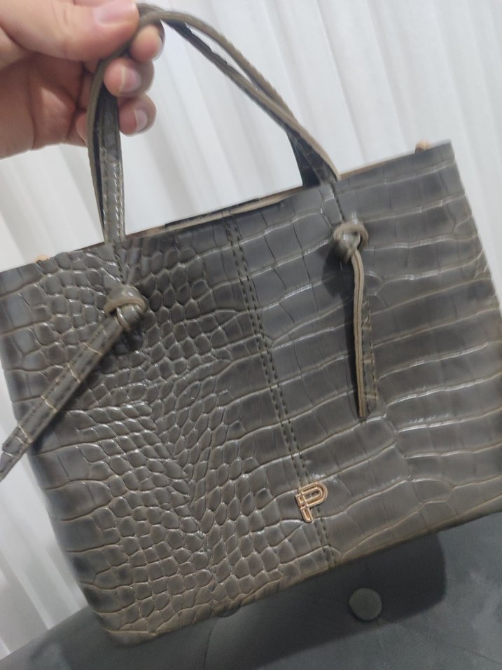 Gri deri yılan desenli, tokalı detaylara sahip kadın çantası, trend sokak stili için uygundur.