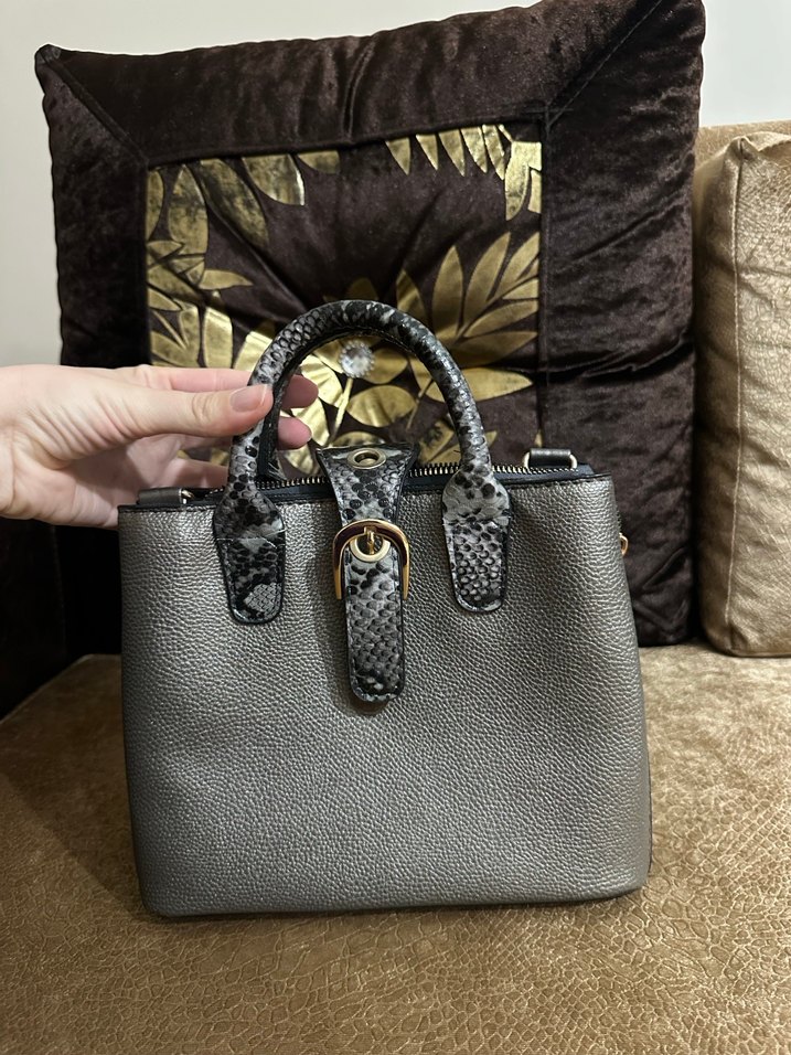 Gri deri yılan desenli ve tokalı tasarıma sahip kadın çanta, modern klasik ve Paris şıklığını günlük kullanıma sunuyor.
