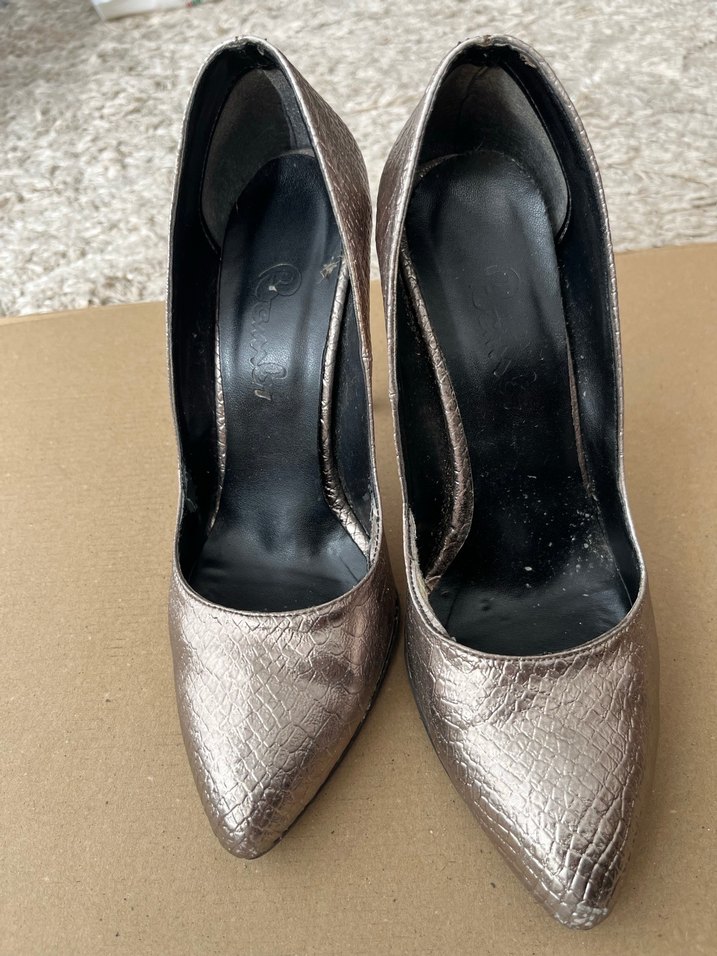 Gri deri yılan desenli stiletto, tokalı detayıyla klasik şıklığı modern dokunuşla buluşturuyor.
