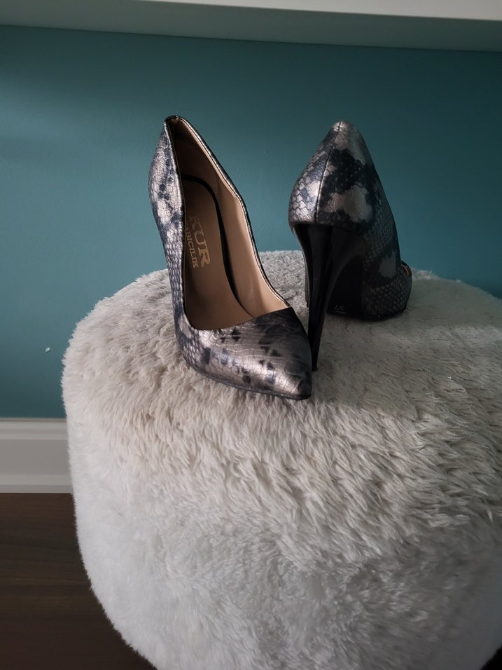 Gri yılan desenli deri stiletto topuklu ayakkabılar, kürk detaylarıyla şık ve çağdaş bir görünüm sunar.