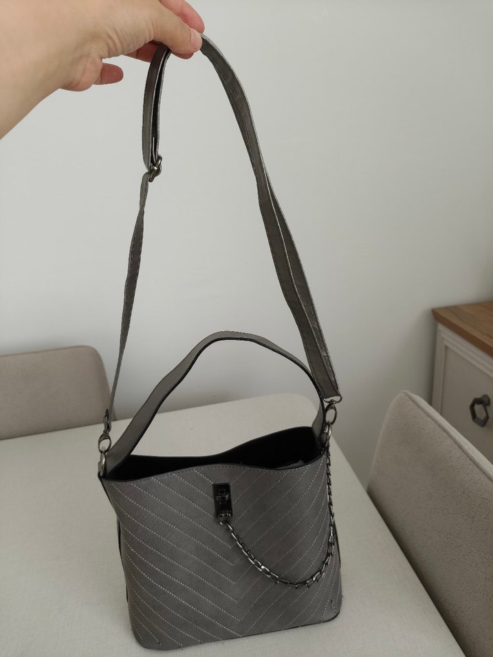 Gri deri yılan desenli, zincir detaylı kadın çanta, günlük kullanım ve şık sokak stili için uygundur.
