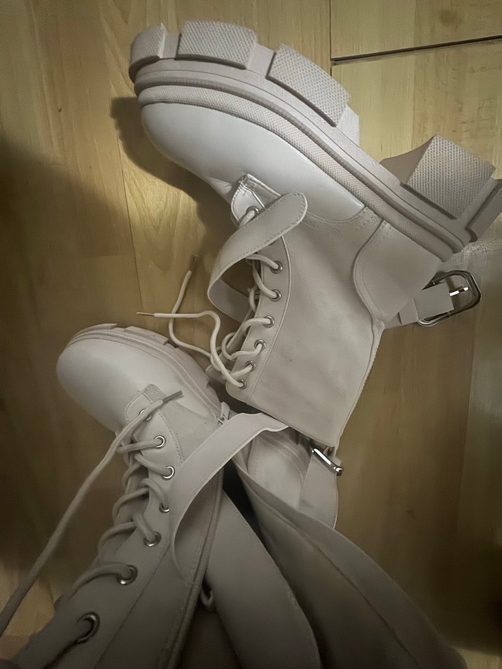 Gri deri, yüksek topuklu, bağcıklı ve tokalı sokak tarzı botlar, trend günlük kullanım için uygundur.