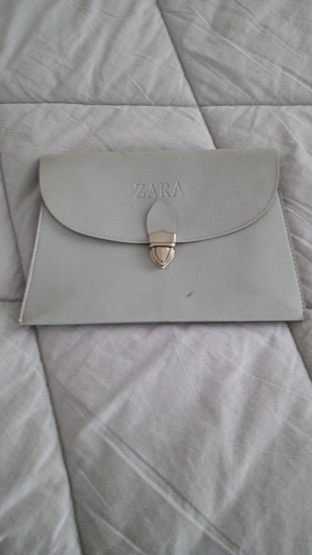 Gri deri Zara kadın çanta, fermuarlı kapanışa ve minimal baskılı tasarıma sahiptir. Günlük kullanıma uygun bohem stilinde.