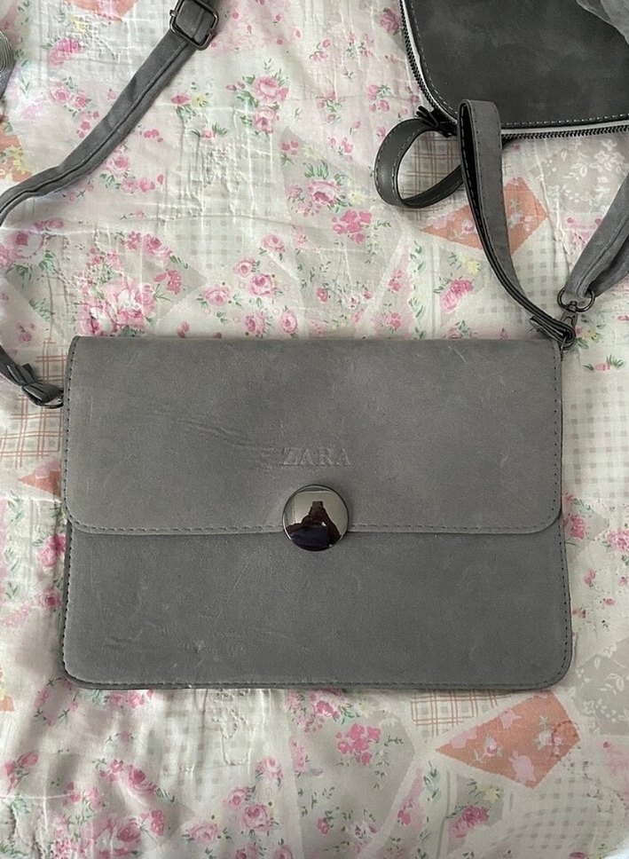 Gri deri Zara kadın çanta, tokalı kapak ve hafif desenli dokusuyla bohem Paris tarzını yansıtıyor. Günlük kullanıma uygundur.