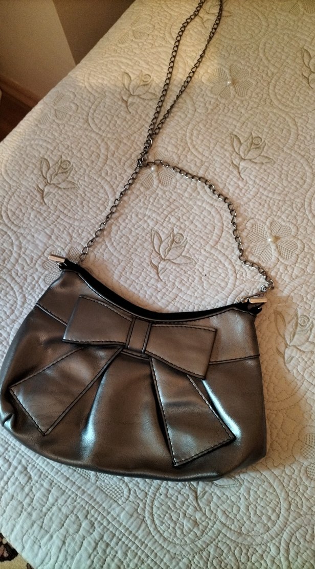 Gri deri çanta, zincir askı ve büyük tokalı fiyonk detayıyla gotik ve Paris tarzını birleştirir. Günlük kullanım için uygun.