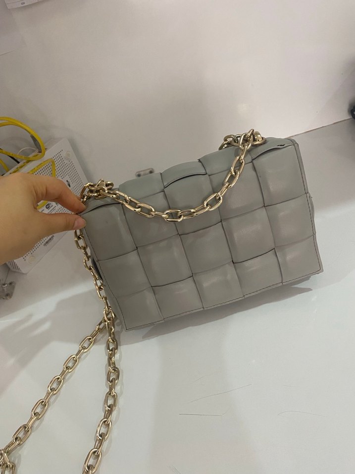 Gri deri kadın çanta, kareli desene ve zincir detayına sahip, trend sokak stiline uygun.