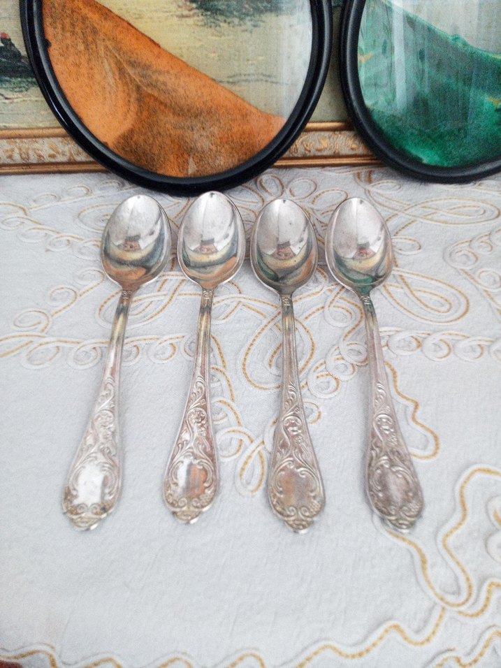 Gri tonlarda, dekoratif saplara sahip dört adet kaşık seti. Dayanıklı ve pürüzsüz malzemeden üretilmiştir.