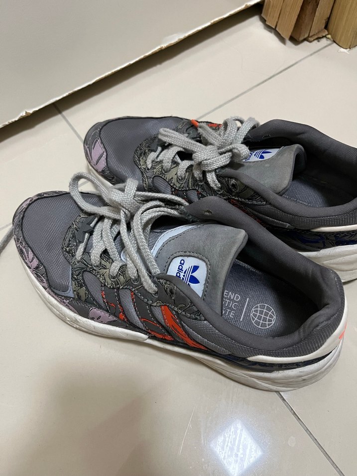Gri renkte, desenli Adidas kadın spor ayakkabısı. Düz kauçuk tabanlı ve kolay kullanım için cırt cırtlı bantlıdır.