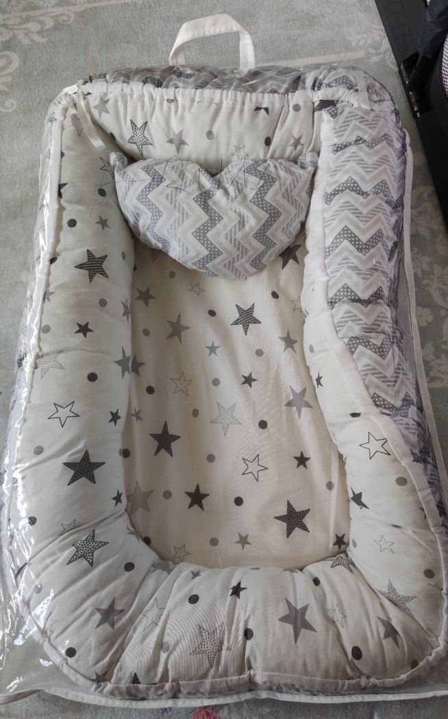 Gri sentetik kumaştan, yıldız ve zikzak desenli bebek uyku alanı, rahat bir uyku alanı sunar. Düz kafa minderi ve Kolik kiraz çekirdeği kemeri Babynestin sadece minderi kullanıldı. kendisini hiç kullanmadık.