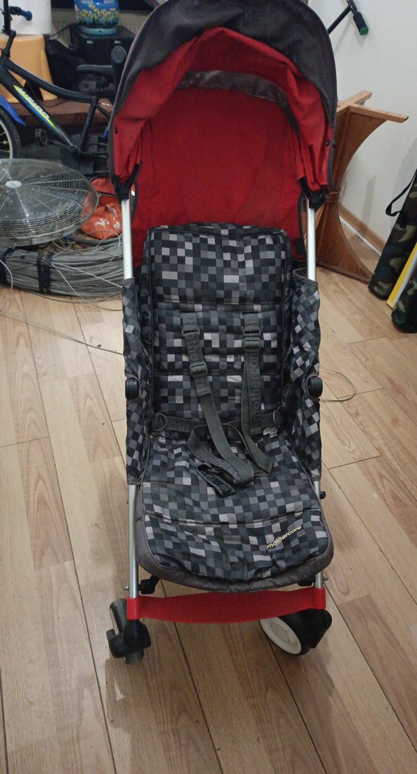 Gri kare desenli oturma kısmı, ayarlanabilir güvenlik kemerleri ve kırmızı tenteye sahip bebek arabası. Dört tekerlekli ve hafif yapılıdır.