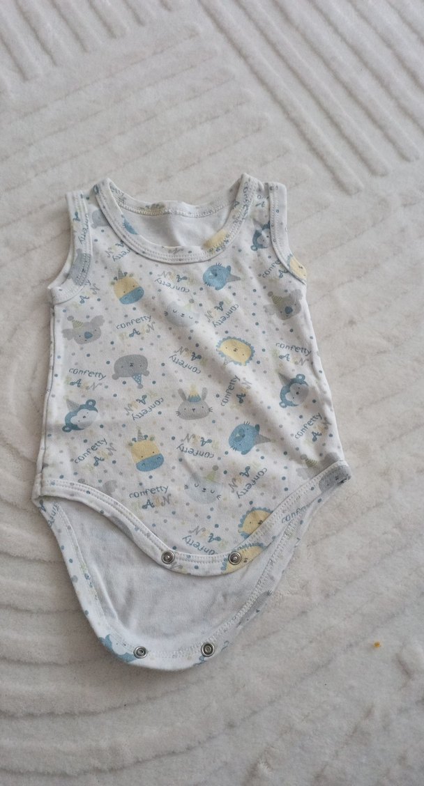 Pamuklu, askılı gri bebek body, yuvarlak yaka ve kolay giydirme için düğmeli. Hafif hayvan desenleriyle sade bir tasarım sunar.