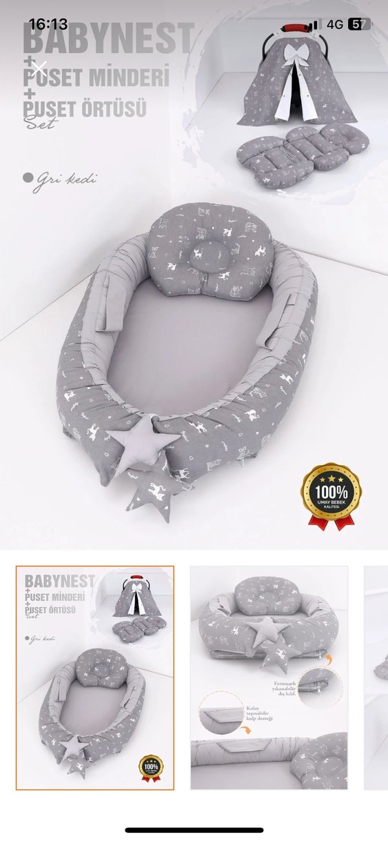 Gri renkli babynest +puset minderi+puset örtüsü+bebek düz kafa yastıgı