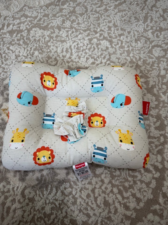 Gri renkte, yumuşak kumaştan yapılmış ve aslan, zürafa, zebra gibi renkli hayvan desenleri bulunan bebek baş yastığı.