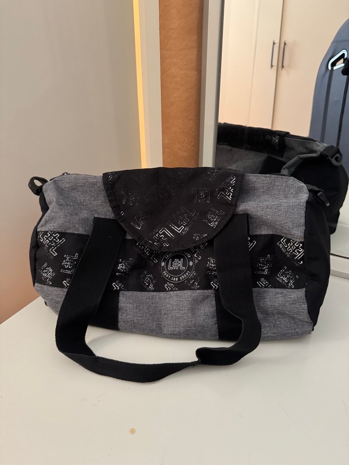 Gri renkte, desenli ve siyah saplı sağlam bebek çantasıdır.