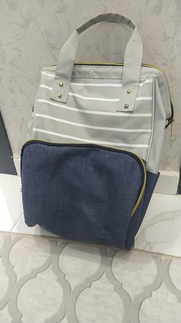 Gri renkli, çizgili desenli bebek çantası, geniş ön cepli ve kullanışlıdır.