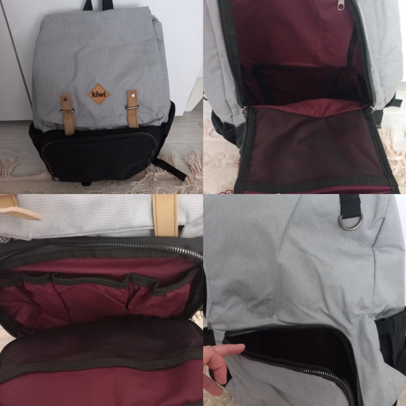 Gri renkli, desenli bebek çantası, fermuarlı ve file ceplerle düzenli depolama sağlar. Rahat taşıma için askıları mevcuttur.