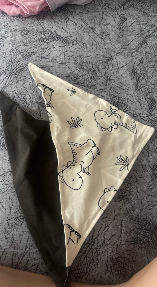 Yumuşak kumaş üzerine baskılı dinozor desenli, gri ve siyah renklerin kombinasyonuyla bebekler için pratik ve sevimli önlük.