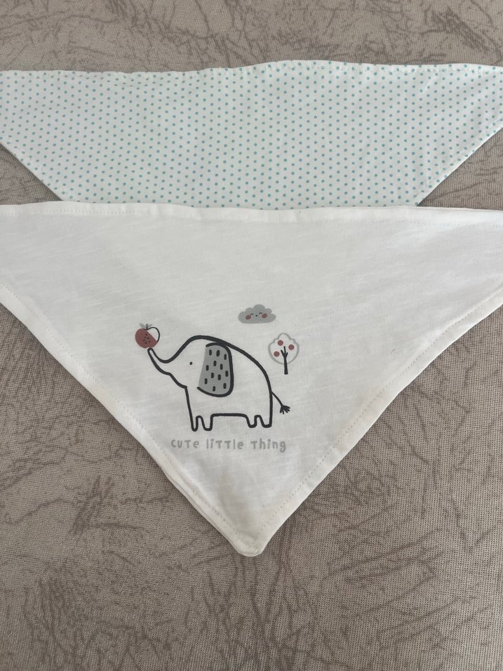Gri renkli, desenli bebek önlükleri; biri fil ve küçük noktalar baskılı. Üzerinde "cute little thing" yazısı bulunur.