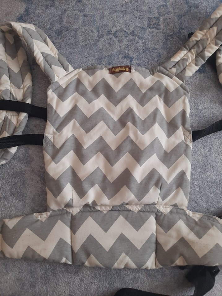 Gri zigzag desenli, dolgulu askılı ve destekleyici bel kemerli bebek taşıyıcı.