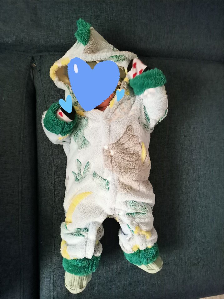 Gri renkli, dokulu bebek tulumu, baskılı dinozor desenleriyle sokak stili sunar. Kapüşonlu ve canlı yeşil manşetlidir. #kışlık